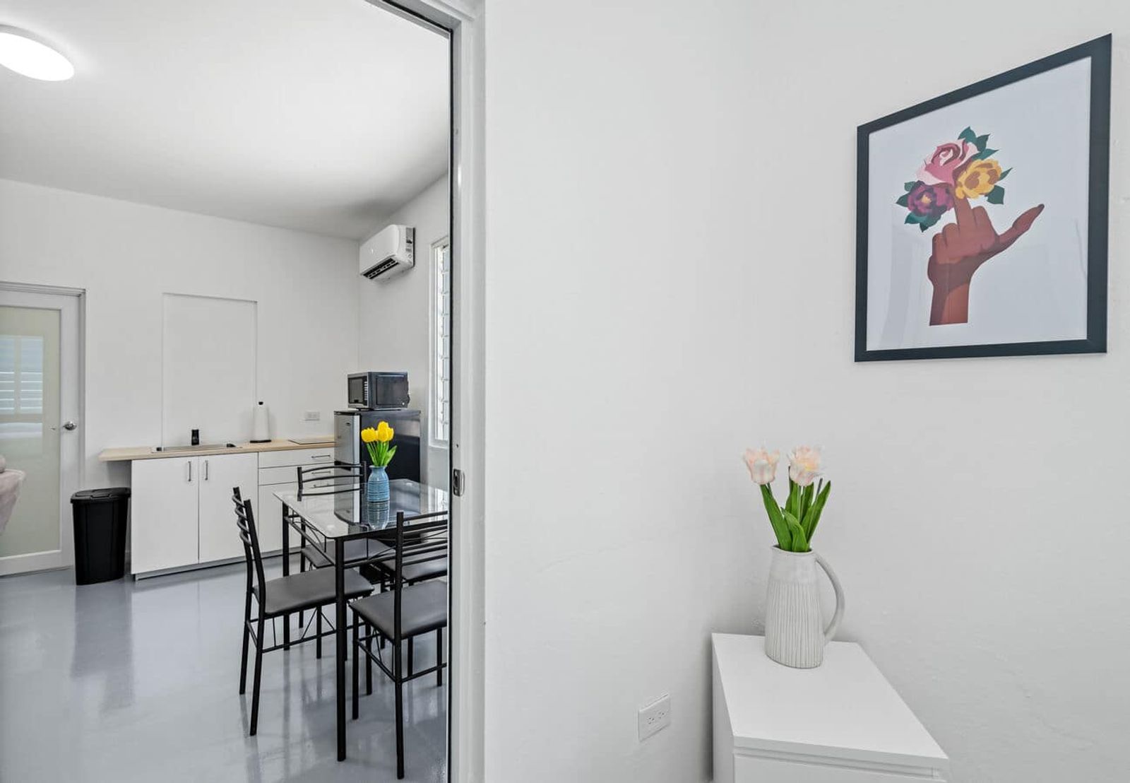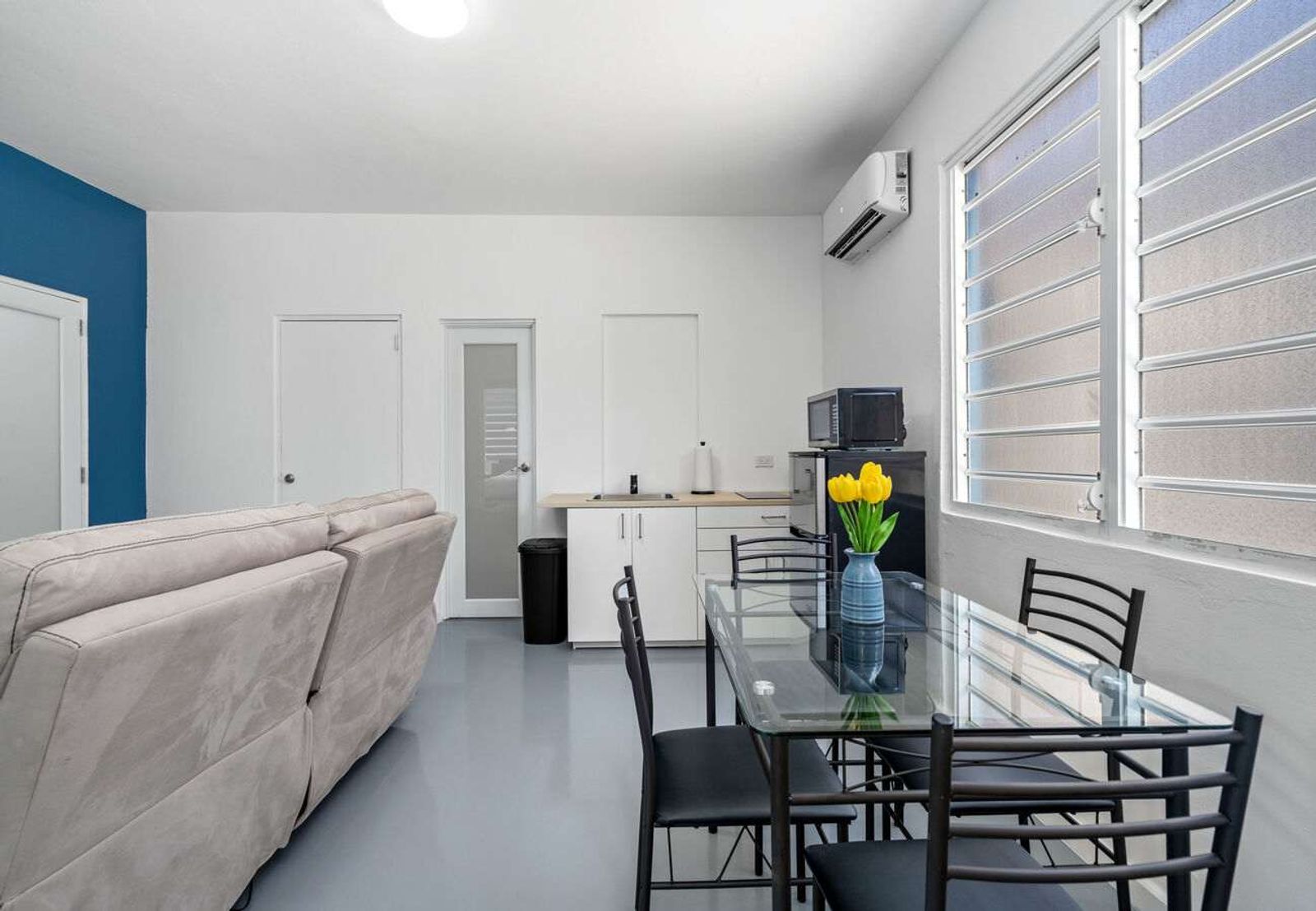 Sensibo air units have been installed on the premises. Please refrain from disconnecting these devices, as they are specifically designed for remote control of the air conditioning and humidity management. The small white/black devices are strategically placed near the kitchen, bedrooms, and close to the mini-split A/C unit for optimal functionality.