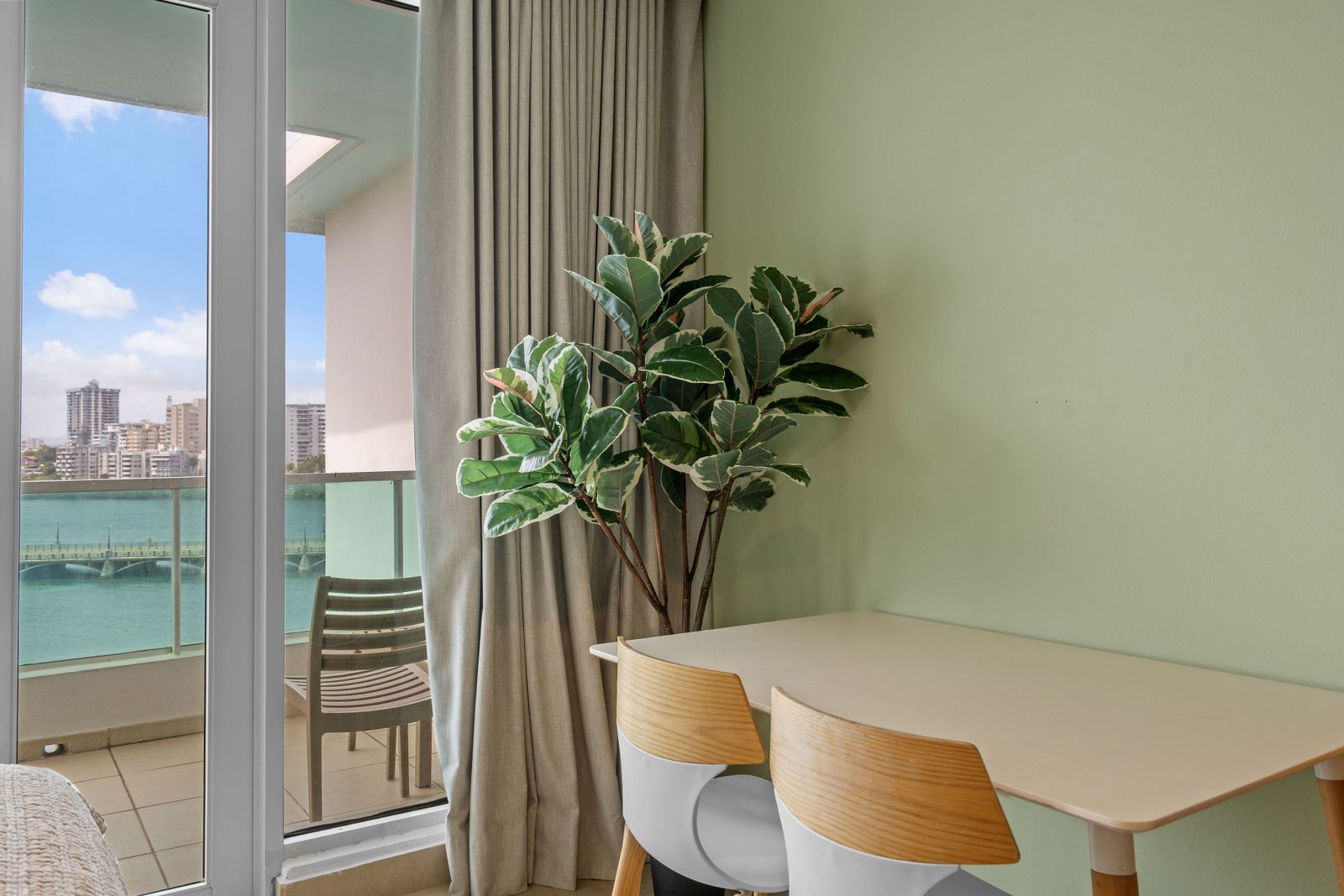The living area is cozy and functional, with a relaxing vibe perfect for unwinding after a day of exploring. Plus, the private balcony with ocean views is the star of this space. Whether you're sipping coffee in the morning or watching the sunset in the evening, it’s the ideal place to relax and take in the beauty of San Juan.