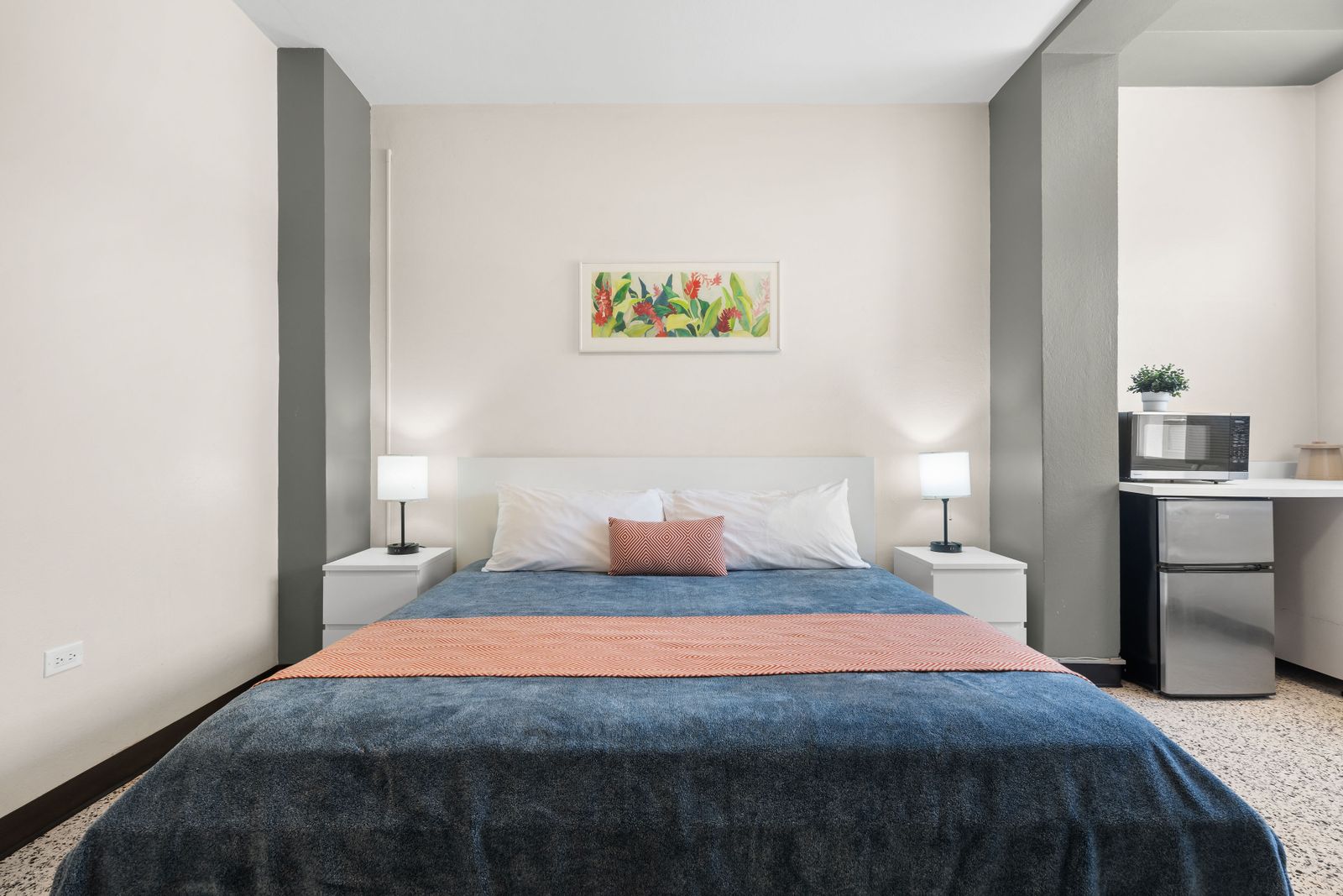🛏️ Modern guest suite with plush queen-size bed, rapid Wifi, small cooler and stream TV for premium repose