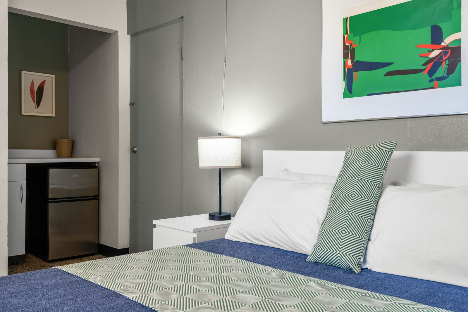 🛌 Sleep sanctuary featuring plush bedding, compact chiller, streaming screen, and effortless ease