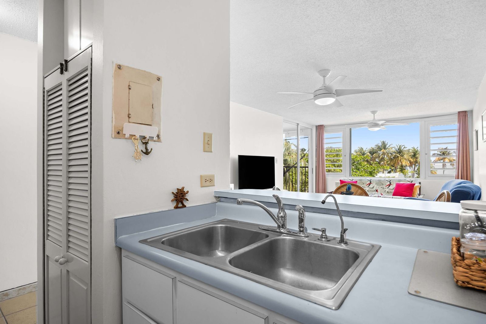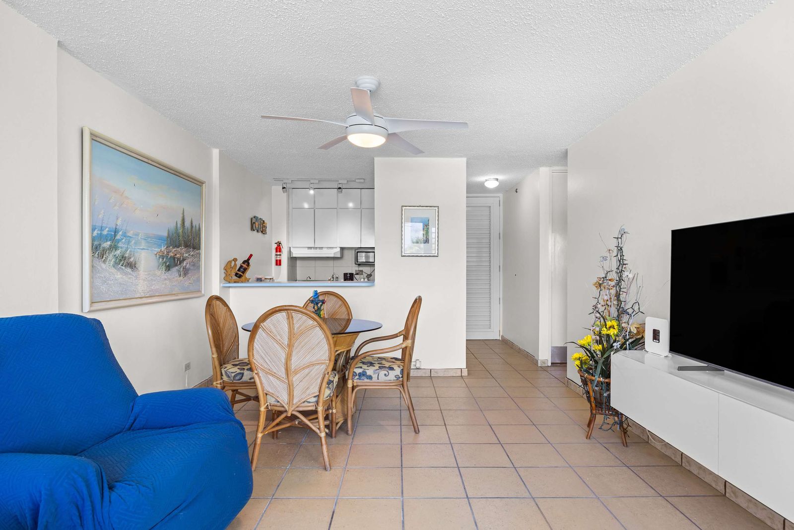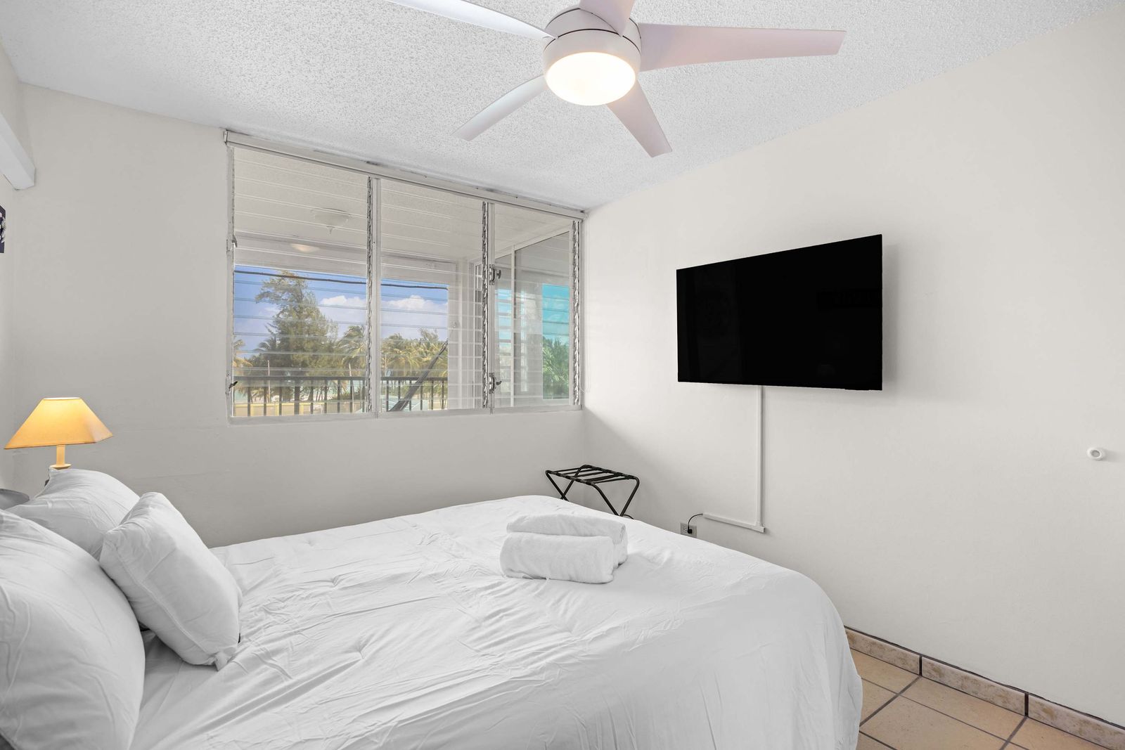 📺 Modern Living: Cozy lounge with high-definition TV, AC, and bright coastal decor.