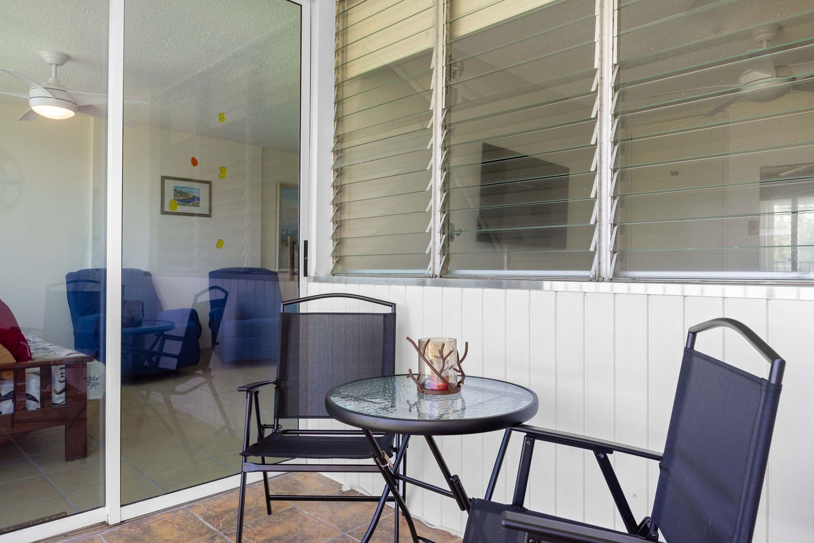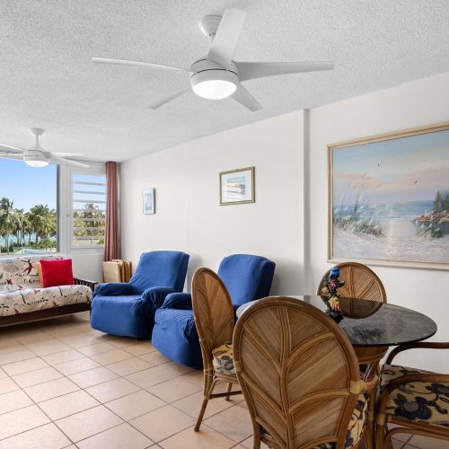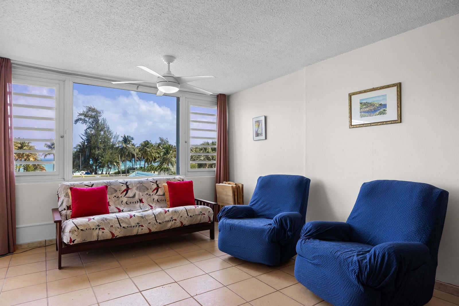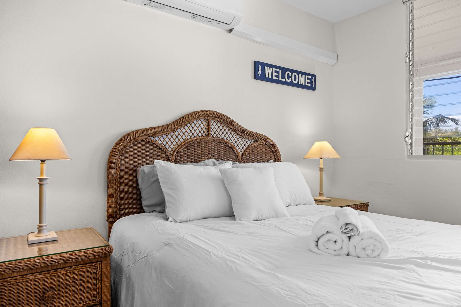 📺 Modern Living: Cozy lounge with high-definition TV, AC, and bright coastal decor.
