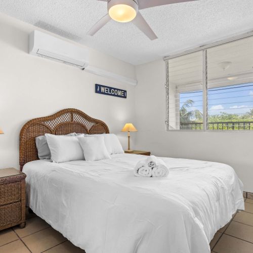 🛏️ Restful Slumber: Bright, peaceful bedroom with a queen bed and overhead fan.