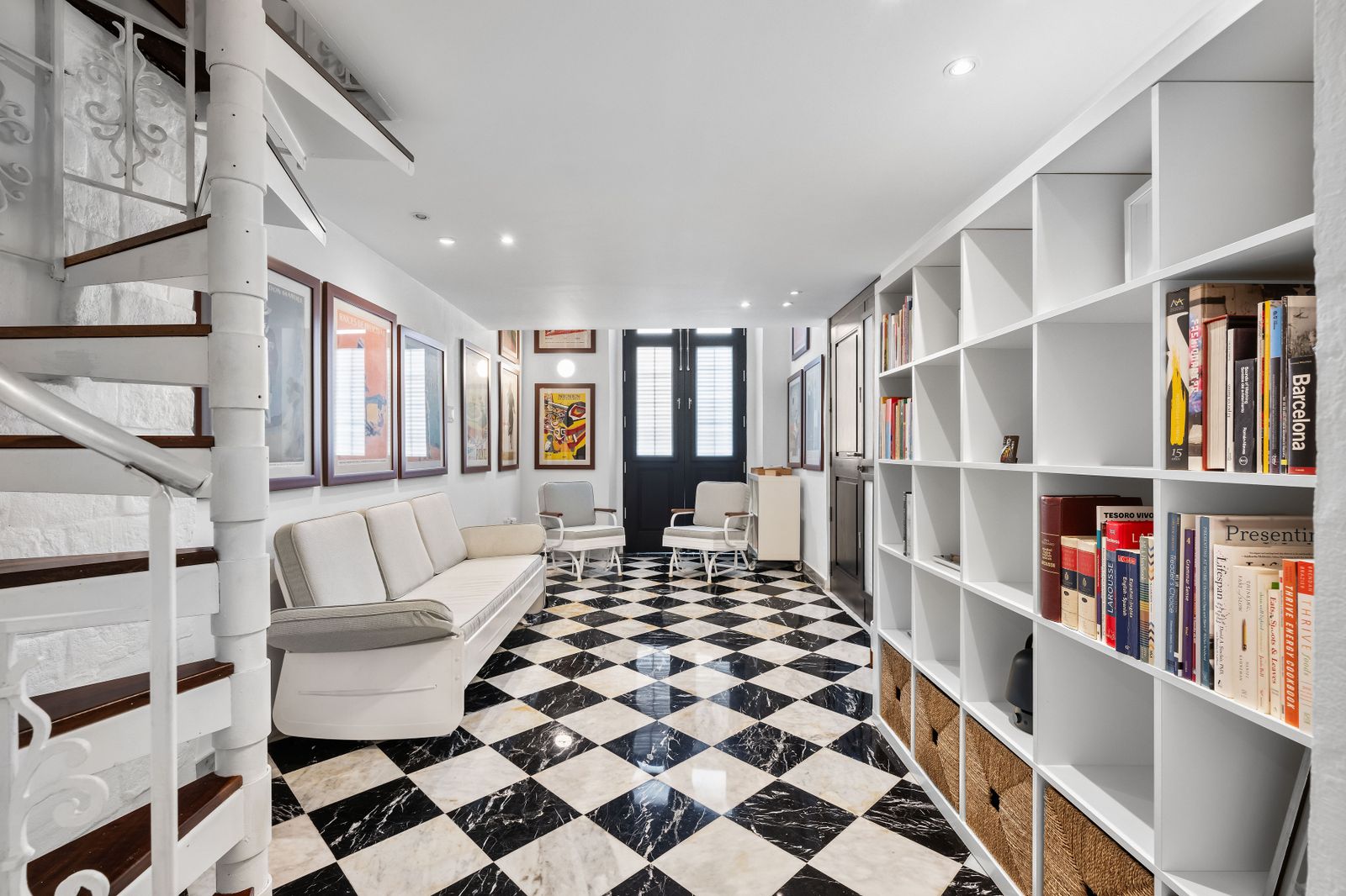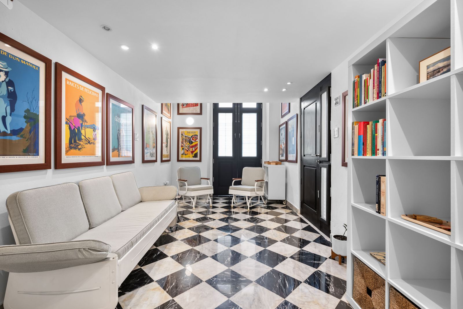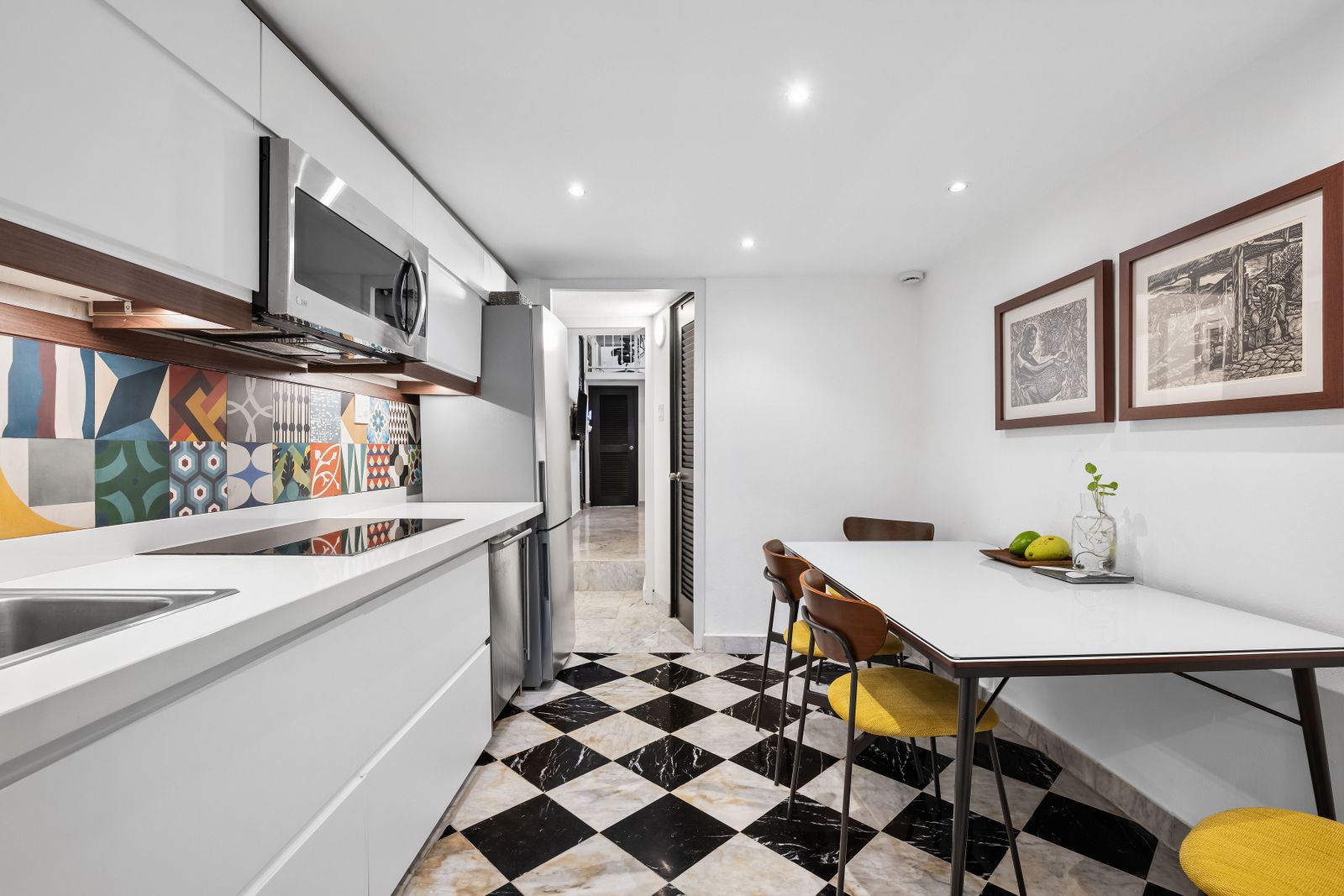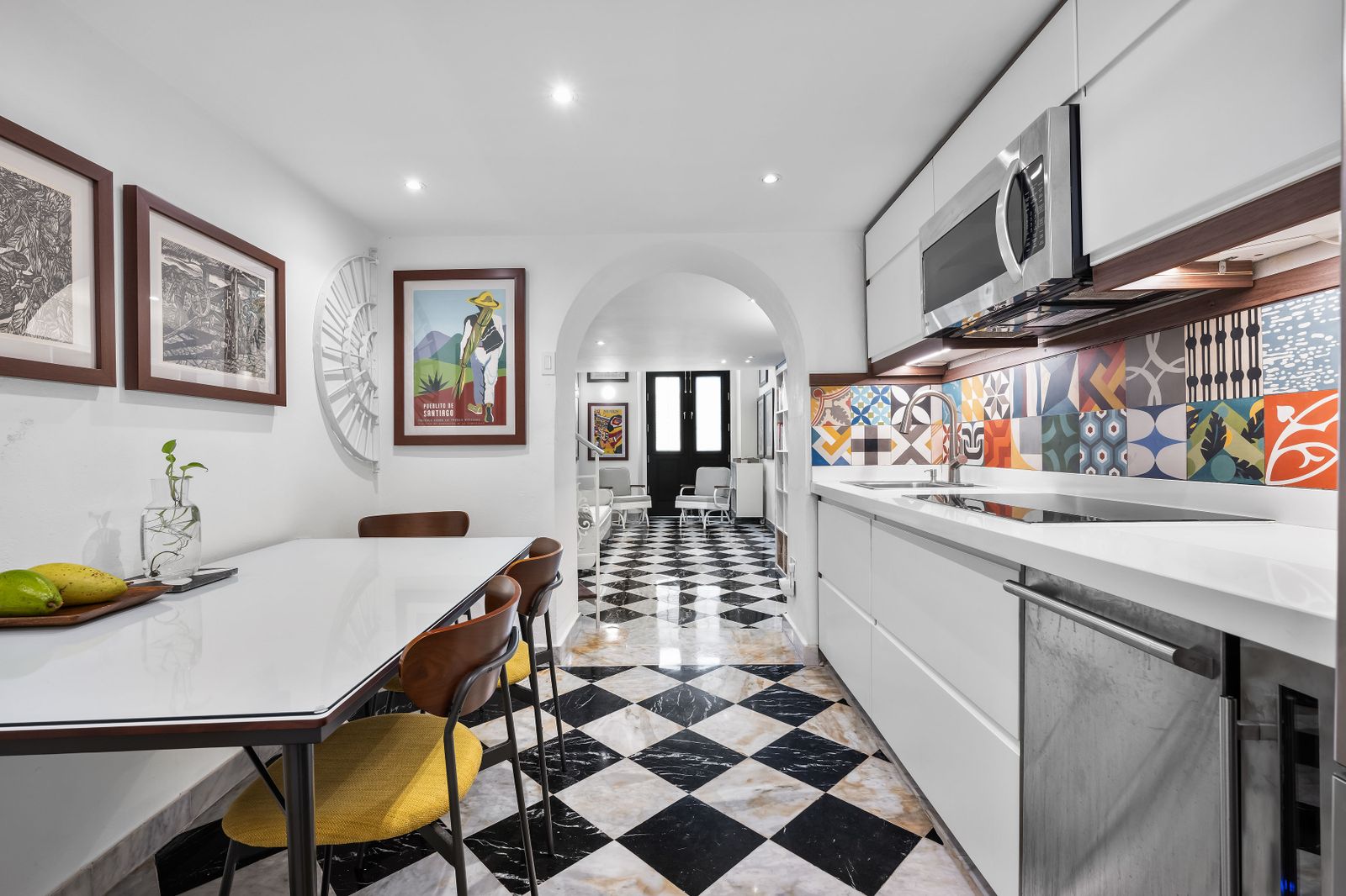 Design Aesthetic: The apartment maintains a beautiful, high-contrast style: dramatic black and white checkered marble floors provide a chic, bold foundation, complemented by bright white walls and dark wood accents.