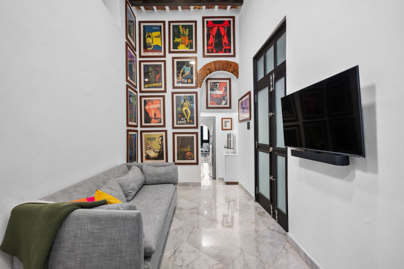Living Areas: The main floor features a comfortable white sofa and extensive built-in shelving, while the second lounge offers a relaxed grey sofa, a gallery wall of framed posters, and a wall-mounted Smart TV.