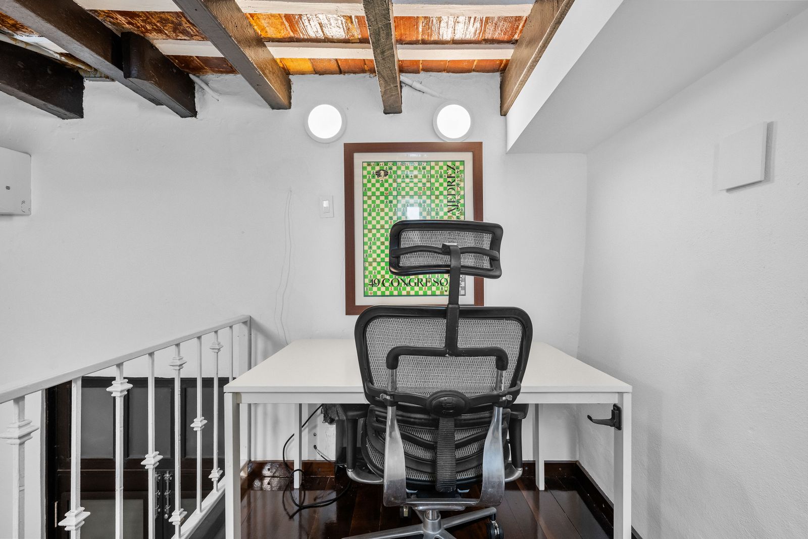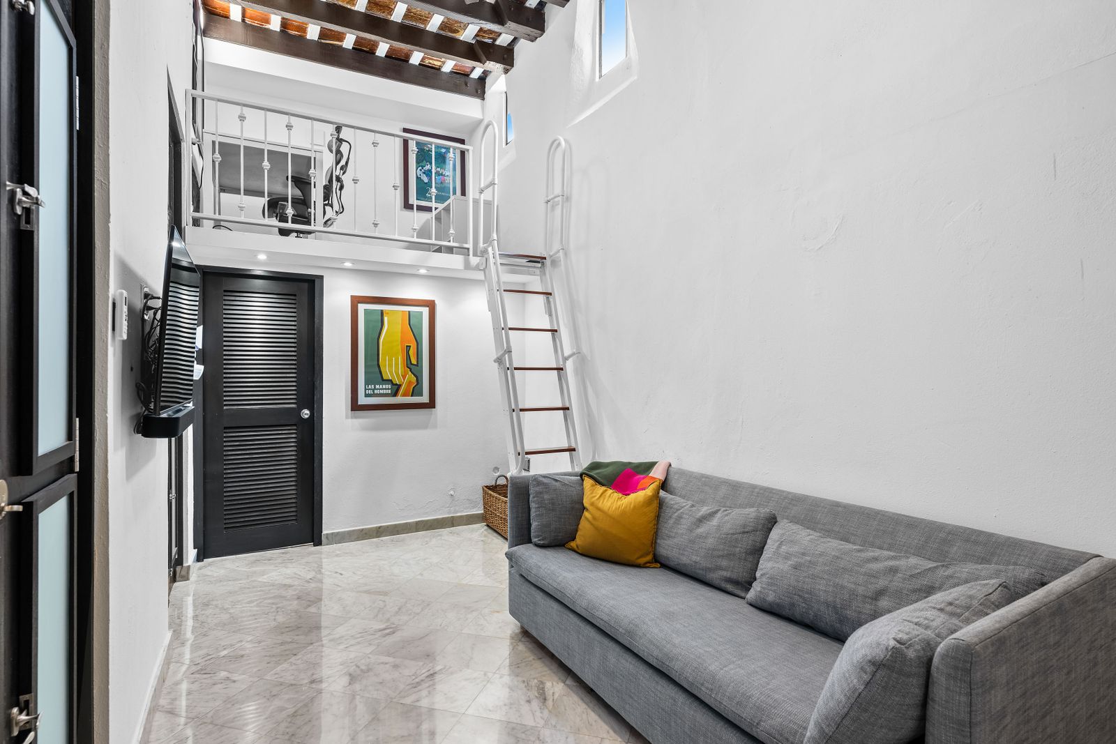 The loft-style unit on two levels features a main floor with a living area, a modern kitchen, and a dining nook/dedicated workspace. A spiral staircase leads to the upper level’s second lounge with a cozy sofa and Smart TV.