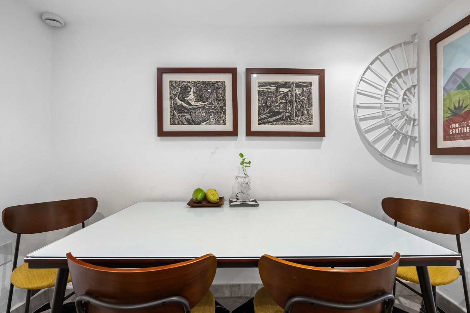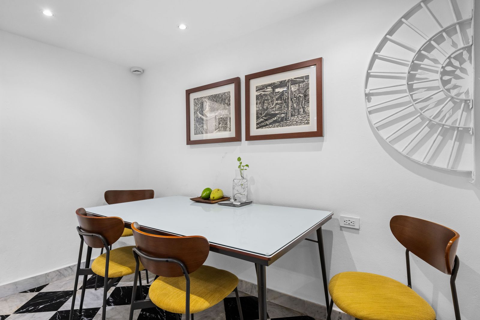Workspace & Dining: The bright dining nook features a clean white table and stylish yellow-cushioned chairs, perfectly set up to serve as your dedicated workspace or for enjoying meals.